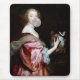 En kvinna i en röd satinklänning med en ren shawl håller en blombukett medan han blåser en stor bubbelgummi. Den historiska klädesplaggen och hårstilen antyder en gammal era, men ändå inför bubbelgumman en lekfull, modern tvist.