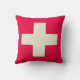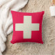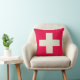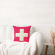 Kudde med beigekordesign på röd bakgrund.