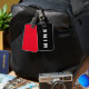 Den roliga svarten och den röda bagagemärkren med "bryter" skriftligt på det