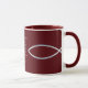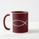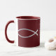 Silverfisken på Burgundy bakgrund dekorerar denna mugg med ", och Jesus sade unto dem, komen ye efter mig och mig ska gör dig för att bli fishers av manar.", Markera 1:17
