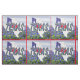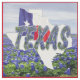 Statliga Texas skisserar med Texas flagga- och Texas brevutklipp i bluebonnets på en bakgrund av bluebonnets och blå himmel som skrivs ut på tyg.
