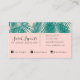 En elegant- och summeriskonstruktion av vackert handflatan löv-färgad i en djup turkos-grönt och placeras på en korall rosa. De är placerade på kortets framsida och baksida. Affärskortet för trendig av tropisk härkomst fungerar bra för människor i ett rese- eller designat fält, som t.ex. resande agent, insida-formgivare, resa-rådgivare eller målevenemangsplanerare. Framsidan har ett kursivt skriptteckensnitt för anpassadet i svartvitt och ett ställe där du kan lägga till din jobbtitel. Baksidan innehåller medieikoner i social och genom att klicka på "anpassa" kan du flytta varje ikon individuellt. Det här affärskortet är ett mycket chic och modernt sätt att visning din företagsinformation, med dess enkla palett för rosa och grönt färg.