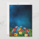 En inbjudan till tropisk sommar party, stranden party. En mörk blått himlar som bakgrund. Grönt handflatan träd lämnar och tre blommor i blått, gult och rött och som blommor. Mallar för information om party. Tillbaka: mörk blått himlar och papegojor.