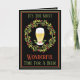 Rolig juldesign för ölföretagen! Designen har en julkrans av järnekblad och bär. I mitten av kransen är ett glas öl. Ölgaset är fullt med skummande öl. Vid botten av ölgaset finns en liten kvist järnek. Ovanför och under kransen finns text i grön och orange-röd typsnitt som säger "Det är den underbaraste tiden för en öl!" Bakgrunden på designen är svart med grön och orange-röd kant. Insidan av kortet har samma svarta bakgrund med grön och röd kant. Det finns ett foto av en öl som hälls från en flaska i ett ölglas. Under fotot finns anpassningsbar text i mörkgrått och orange-rött typsnitt där du kan lämna texten som den är eller anpassa med din egen julhälsning och ditt namn. Du kan läm