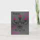 Min teckning av en elegant gotisk stearinljushållare i svart och grått med fladdermössvingar, virvlar runt, och virvlar runt fåniga stearinljus för shock rosa och rosa juvlar på en grungy grå bakgrund med shock rosa. Visat här på ett bröllop tacka dig att card.