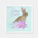 En vacker Påskhare sitter bakom en underbar bukett av lila och tealblommor på en underbar pastel teal party papper napkin med elegant personlig lavender-skript av din familj namn under Glad påsk. Chic, söt Glad påsk utomhusdekan.