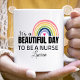 Det är en vacker dag att vara en sjuksköterska på mugg. Det är en vacker dag att vara sjuksköterska. Det är en rosa hjärna och ord. Underbar personlig för familj, vänner eller medarbetare. Färgfull design, så att du får massor av leenden.