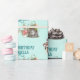 Den här magiska och visuella presenten med pappra inslag har ett föränderligt skogstema. En bild av en älvdörr i en liten svampträdgård placeras vid grund, med en fjäder ovanför den. Olika blommor och svampar placeras längs grund. Bakgrunden är en faded teal mönster. Ett exempel på namn och Grattis på födelsedagen hälsning trycks ovanför mjölkrummet, som du kan anpassa för att inkludera ditt eget namn eller egen text.