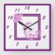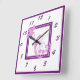 Denna nätt vägg tar tid på särdrag en violet som den rosa art décoblomman avbildar uppsättningen mot en dubbel mörkare violett lila kvadrerar ramen. Numrerar är, i att matcha violeten, och ta tid på avslutas med en matcha violett yttre ram.