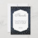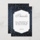En enkel, modern, elegant- och chic-födelsedagsfest eller något annat evenemangstack med en denim-bakgrund, ord THANKS som täcks av rinestoner (simulerade, inte riktiga stenar) och i moderna kalligrafbilder, typografi i vitt, samt en elegant ram med rinestoner gräns. En chic "denim and diamonds"-design för en kvinna i alla åldrar, på hennes 21:e, 30:e, 35e, 40:e, 50:e, 55:e, 60:e, 65e, 70:e, 80:e eller 90:e födelsedag. för en möhippa, babydusch osv.!