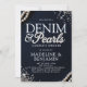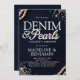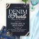 En modern, elegant och chic, denim och pärlpars duschinbjudan med ett denim-, diamanter och pärltema. Den har en denim-bakgrund, elegant-rhinestoner och pärlor (detta är digitala effekter, inte riktiga stenar eller pärlor!) anpassningsbar-brev för ord "denim" och typografi i vitt. En chic "denim and diamonds and pearls"-möhippa bjuder in ett modernt par som kärlek denim.