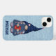 En söt gnomflicka i en denim-klänning och hatt och röd väska
