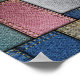 "Denim Patchwork": en symmetrisk arrangemang av texturerade, tygliknande rektanglar i muterade toner av blått, grönt, rosa och beige. Layouten liknar en lapptäcke eller mosaik, där varje block är noggrant justerat för att skapa en balanserad, rutnätsliknande struktur.