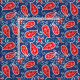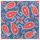 Denna design ger en nicka till 70-talbandanasna med en hand plockade ryschiga paisley och blommönstret i rött och vit på en struktur för blåttdenimjeans. Betonat med rött och vit blommar, pricker och virvlar runt, och områden av fast blåttdenimstruktur, denna gulliga design är a bet lite seventies, bet a lite landflickan och den Americana slutsumman. Detta handcrafted mönster drogs i en konstnärlig klotterstil som därefter förhöjdes digitalt av Sue Chastain, aka PatternAddict. Shapar och linjer är avsiktligt variabeln och unikt.