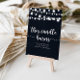 Denna ljus brinner rustika ljussträng skylt är perfekt för ett enkelt bröllop. Designen har vackra handmålade ljussträngar på en mörkblå bakgrund.
