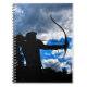 Ein Bogenschütze mit Kettenhemd im Mittelalter Stil, mit Pfeil und Bogen in Silhouette vor blauem Himmel und mit Wolken