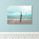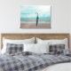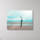 Ein Regenschirm steckt im Sand, am Strand vor dem Meer mit vielen Wellen und zarten Farben
