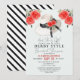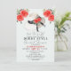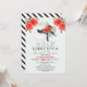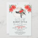 Fira bruden med denna eleganta och moderna derby-inspirerade bröllopsdusch-inbjudan som har en akvarellillustration av en stor hatt med rosor och en svart slinga på en ljusblå bakgrund. Baksidan har ett mönster av svarta och vita ränder. Anpassa den efter dina behov.