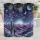 Denna fantastiska illustration skildrar ett serenökenlandskap under en andningsfull natt himmel. Silhouetted saguaro cacti står emot rullande lila sanddyner, som lyser med ett starkt, stigning ljus vid horisonten. Ovanför detta skapar ett magiskt celestialt panorama från ett detaljerat fullt, måne, många stjärnor och konstellationer.