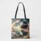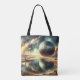 En massiv metallsfär vilar över ett reflekterande, ofruktbart landskap och skapar en svår men meriserande scen. Himmel är fyllt med vibrerande, virvelformade moln, vilket kastar dramatiska reflektioner i vatten nedanför.