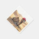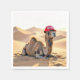 A camel lying on desert sand, wearing a red hat with "Retired" text, against a background of dunes