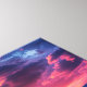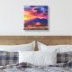 Ett andningsvåg kastar en varm glöd över ett vidsträckt ökenlandskap. Bilden visar ett stort bergsområde som stigning från sanddyner. Himmel är rikt på en kraftig färg av orange, rosa och lila som skapar en dramatisk kontrast till guldsand. De rullande sanddynorna sträcker sig ut i avstånd och skapar en känsla av vasthet och ensamhet.