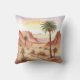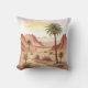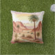 Pillow i en illustration av ett serenökenlandskap som visar upp gyllene sanddyner och klippformationer under en pastel himmel, där handflatan träd är spridd över hela skalet. Det mjuka, varma färg väcker en känsla av lugn och naturskönhet.