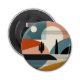 Ett abstrakt landskap i en ökenscen med linjer och former i brunt, orange, turkos, beige, tan och svart.