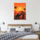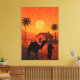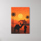 A tranquil desert scene bathed in warm sunset hues. Silhouettes of palm trees, a traditional house, and a camel led by a traveler evoke the peaceful rhythm of nomadic life. This artwork captures the timeless beauty of desert landscapes, ideal for decor, apparel, or stationery with a cultural and natural touch.