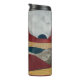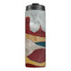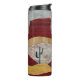 Ett abstrakt landskap med ett unikt färg och struktur som visar en ökenscen med ett stigning blått sol och en kaktus i röda nyanser, grått, beige och blått.