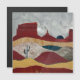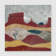 Ett abstrakt landskap med ett unikt färg och struktur som visar en ökenscen med ett stigning blått sol och en kaktus i röda nyanser, grått, beige och blått.