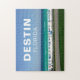 Ett fantastiskt badfoto taget på ett favoritsemestermål för Floridianer: Destin, Florida. Det vackra tealblåa havet vatten i Sandestin möter sandstranden för den perfekt öns landskapsfoto. Ett sött pussel med våt vit typografi på ett kustfoto. Bild under en av dem som bjuder in blå paraplyer på en solnys dag med briljant blå himmel.