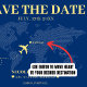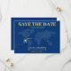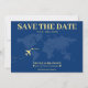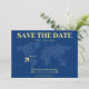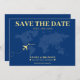 Blått och gult världskarta bröllop spara datum-kort för ett destinationsbröllop. Anpassa den med din händelseinformation.