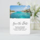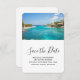 Bröllop spara datum-kort med ett vackert foto med en tropisk strandort. Söt blå stranden vatten och vit sandstrand med överskötta hinnor ge det en stillastående övibe.