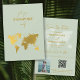 En grönt- och guld-destinationspass för bröllopspass med världskarta över guld, flygplan och resande inslag. Den här designen är perfekt för alla målbröllop mellan Vår, Sommar, Fall och Winter. En grönt för elegant och guld bröllop med passutformning, världskarta och foto för anpassningsbar par. Ett modernt målbröllop sparar datumdesignen med elegant inslag. Det finns också möjlighet att matcha bröllopsinbjudningar och andra artiklar i kontorsartiklar.