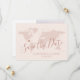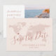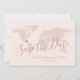 Världskartan för rosa i trendig guld sparar datumkortet för ett destinationsbröllop med en rörlig hjärtmarkör och ditt förlovning-foto bredvid söt och elegant modern typografi som är söt och minimalistisk. Perfekt för giftermål, strand, ö, stad, berg och äventyr över hela världen. Klicka på ANPASSA YTTERLIGARE om du vill redigera mallen och flytta hjärtat, ändra bakgrund, karta och färg, ändra typsnitt.