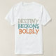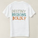 T-shirt-designen har det skarpa budskapet "Destiny Beckons Bolely" i ett fet, flerfärgat teckensnitt. Färg skulle kunna vara varierat och energiskt, vilket skulle återspegla den äventyrliga andan i denna mening. Detta är en perfekt för dem som anammar sitt eget unika väg och jagar sina drömmar med mod.