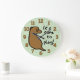 Söt mintgrön väggklocka för hundälskare. Designen inkluderar texten "Det är dags att leka!" och en söt hundillustration. Dessutom är designen dekorerad med benmönster i bakgrunden och stora feta siffror. Stor väggaccent för ett hem för hundägare, ett hunddagis eller annan plats där det finns hundar och hundägare.