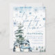 Blå vinter vacker födelsedagsinbjudan. Med pingvin, tallar och snöflingor akvarell.