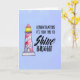 Ett gratulationskort med en akvarellbild av en rödrandig fyr. Med typografi som lyder: Grattis, det är din tur att lysa starkt.