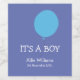 "Det är ett BOY med personlig namn och födelsedatum för vin flaska." Lägg till vin flaska i ge som gåvor eller gör babyduschen ännu speciellare. Blå bakgrund med blå ballong.