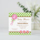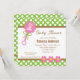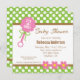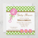 Den här beundransvärda inbjudan till babyduschen innehåller ett flicktema med en rosa baby-rattle med texten: Det är en flicka! Överdelen och grund gräns är kalkgrönt med vit polka dots och ljusbruna accenter. Mittpunkten i inbjudan innehåller anpassade text för duschdetaljer.
