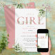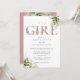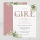 Det är en baby shower-inbjudan för en flicka med elegant dammig rosa rosa typografi och vacker botanisk grönskande lövverk. Designad av Thisisnotme