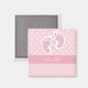 Det är en flicka spara magneten är gjord på blått med vit prickbakgrund och blå fotavtryck från baby.