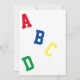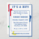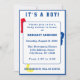 Utformningsfronten har ett anpassade, "Det är en pojke!" i ljusblå brev mot en vit bakgrund. Din text visas i ljusblå brev mot en vit rygg. Bakgrundsbilden är brev, ABC i primärt färg. Ett blått gräns visas runt designen. All text är anpassade. Bakgrundsdesignen har "ABCD" ljusa färger som bakgrund. Designad för samordning med "ABC Baby Shower Collection".