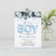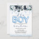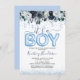 Det är en pojk-blå Blommigt-babyinbjudan. Inbjudningar