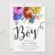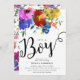 Det är en pojk-, ljus- och fetstil-Blommigt-babyinbjudan. Utformningen har handmålade vattenfärgblommor med gröntens blad och en typisk babyduschmall för eleganter som är enkel att anpassa. Vibrant, färglös, roligt och perfekt vår, sommar och fall, babydusch firande.