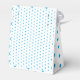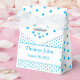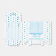Utformningen har en blå och vit polka-punktsbakgrund. Bilden av molnet "Showering" blue rain visas när den öppnas. Namn för Baby tillsammans med förfallodatum visas i blått på en vit baksida mellan blått gräns. Perfekt för en babydusch för pojke.