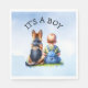 Babyservetter. Cute Vattencolor pojke i suspenderare sitta intill en tysk Shepherd Hund. En underbar liten nyckelfråga för att få varje familjemedlem att känna sig speciell.