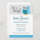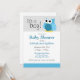 Täck anpassningsbarnas babyduschinbjudningar med ett bildat blått uggla och meddelandet "Det är en pojke!" överst.